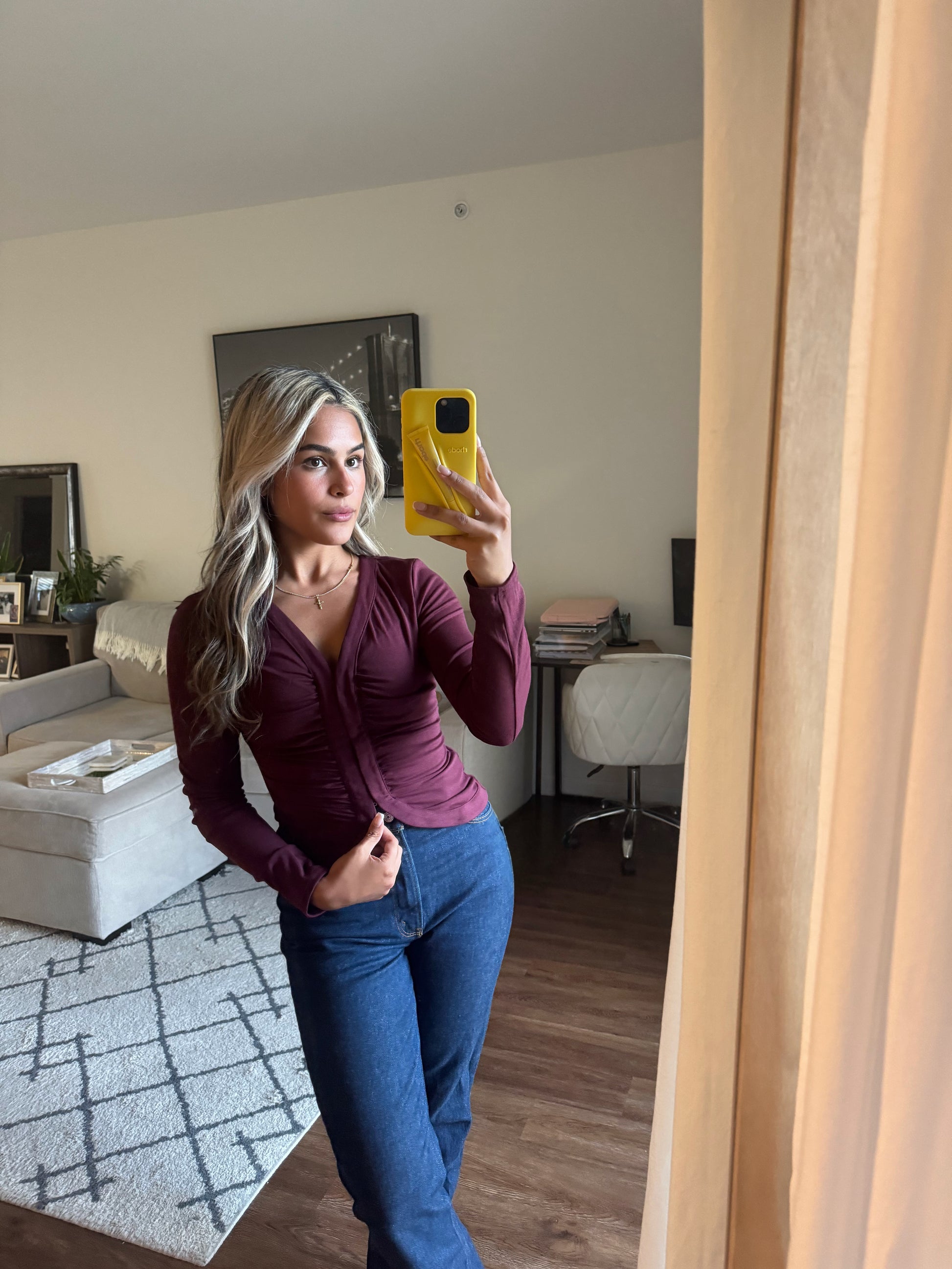 - The Mariela is a rich maroon colored long sleeve that's anything but ordinary.